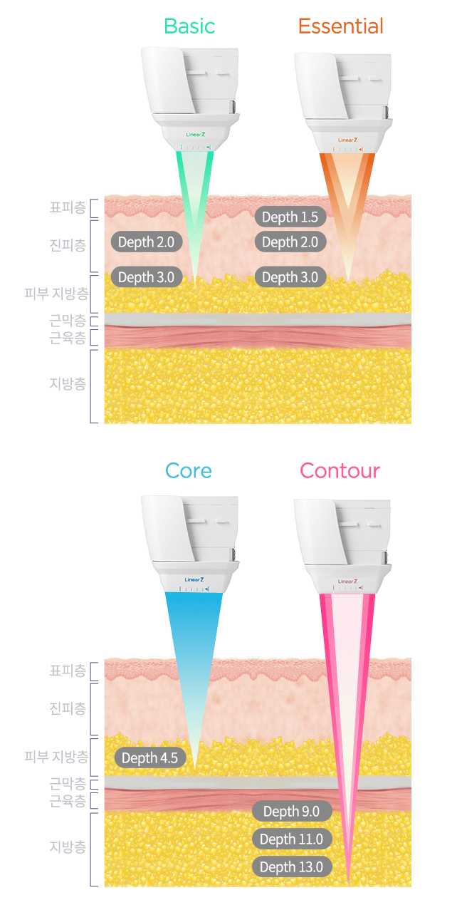 특히, 리니어지는 하나의 카트리지에서 2가지 모드(Linear & Dot)와 다양한 뎁스(깊이) 조절이 가능하여 개인마다 다른 피부 상태와 두께를 고려한 맞춤형 초음파 리프팅 시술을 제공합니다.