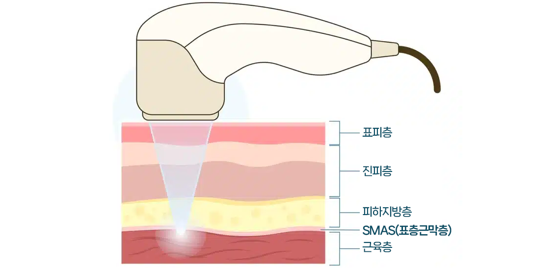 울쎄라는 초음파 에너지를 이용해 피부 속 깊은 층(SMAS층)에 작용하여 피부를 지지하는 구조를 강화하고, 탄력과 윤곽 개선을 돕는 리프팅 장비입니다.